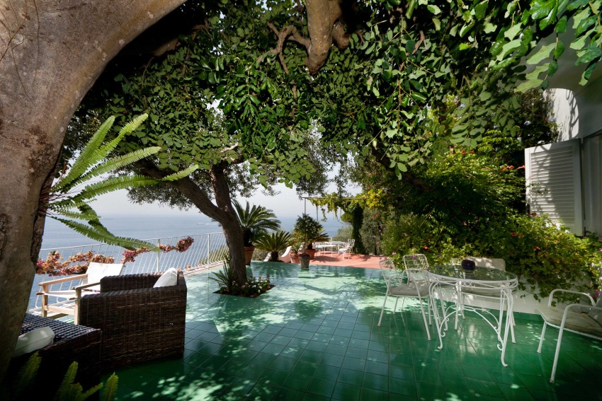 Ground Floor: Sky blue living room with doors opening onto a beautiful and spacious terrace with 180-degree views of the bay of Naples. Kitchen. Outdoor dining space under a patio (no indoor dining area).