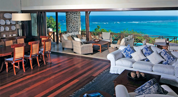 The spacious great room features spectacular views through the large sliding doors. From the terrace the infinity-edge pools blends into the backdrop of the sea. Floors are Travertine marble and the grand vaulted ceiling which has exposed rafters and wallaba shingles.